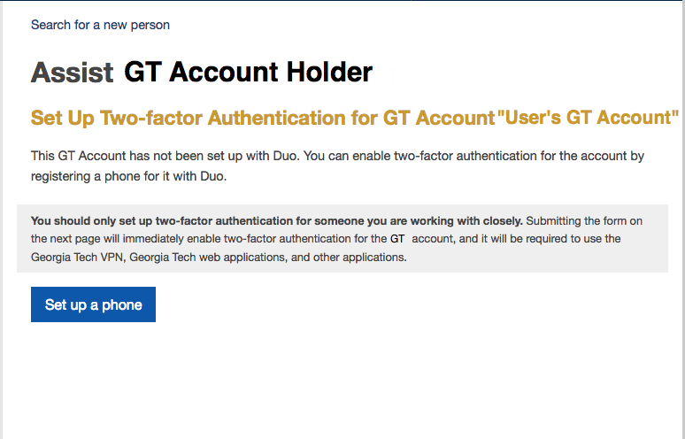 In order to help one of your co-workers by enrolling them in Duo, you first need to log into Passport (https://passport.gatech.edu) and select Assist Another Person.