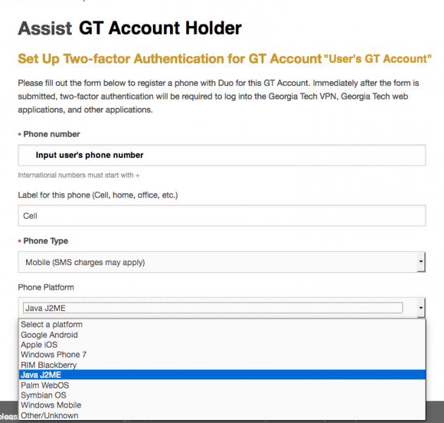 Once all the information has been filled, select the checkbox Send SMS texts with Duo App activation instructions to this phone and click Set up phone. After a brief delay, the new user will receive 2 text messages: one which links to the Duo App download (feel free to disregard this one if the app is already installed) and one which will activate the Duo App with the associated GT account.